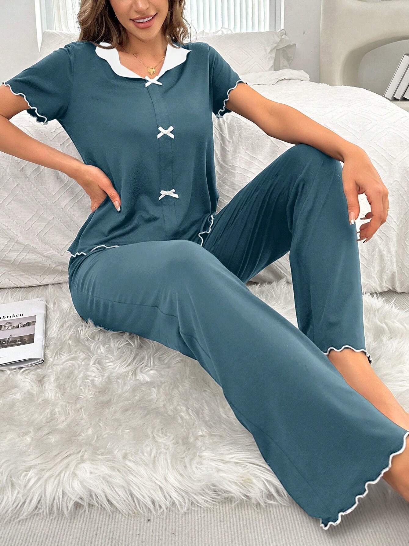 Navy Blue Bow Knott Printed Night Suit