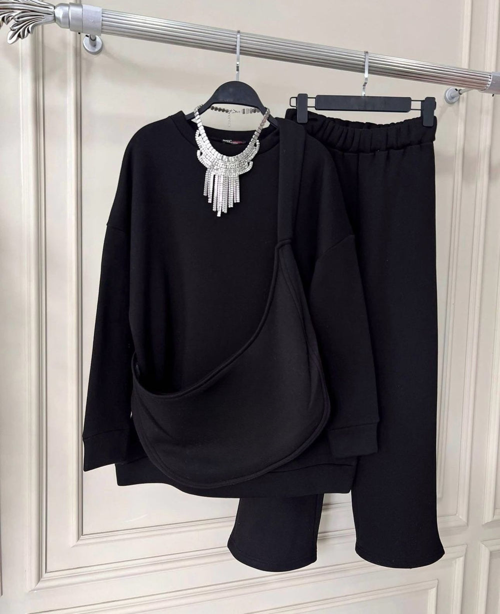 Winter Fleece Fabric Carryall Co-Ord Sets For Women + Bag - Black